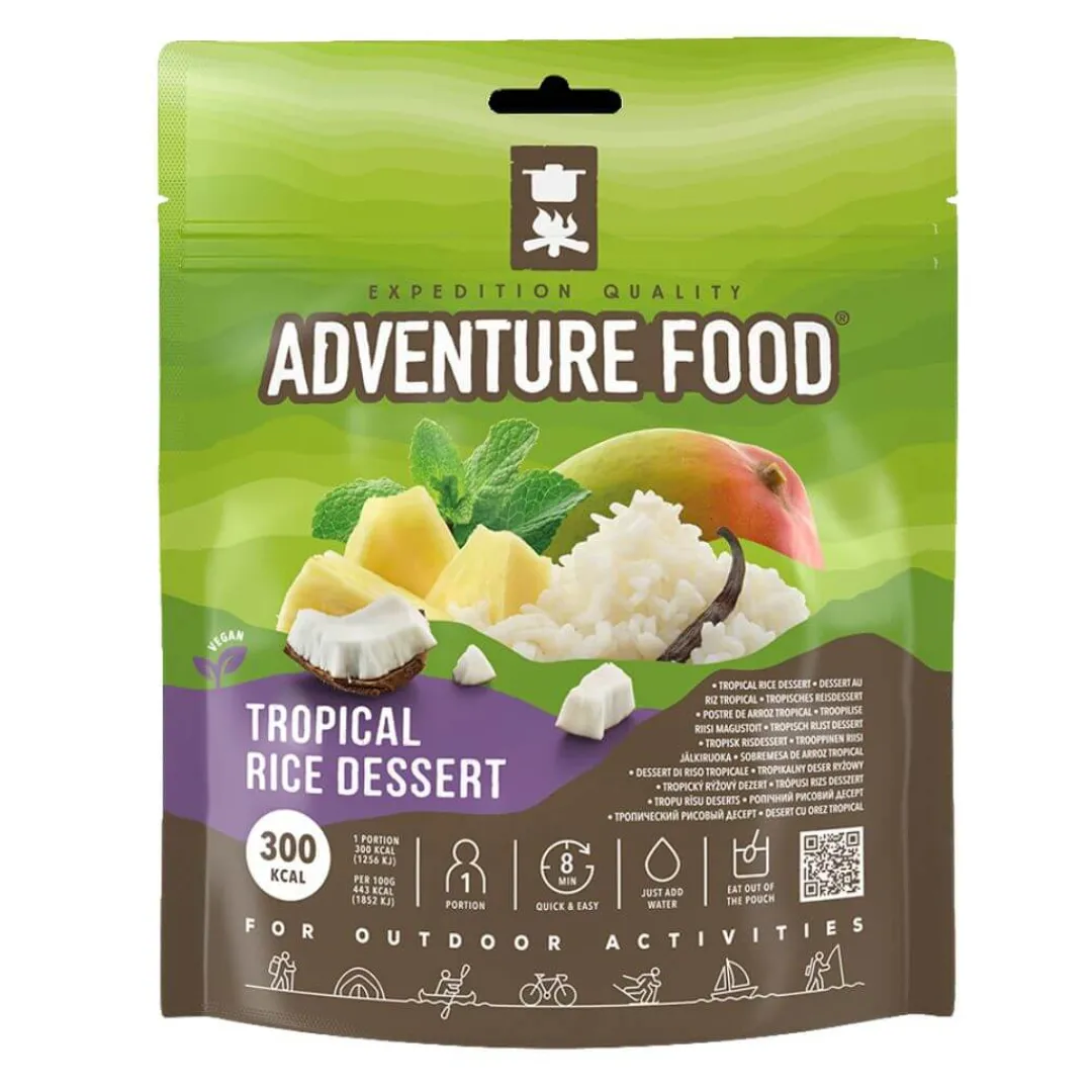 Frysetørret Tropical Rice Dessert ret fra Adventure Food. Tropical Rice Dessert retten er nem at tilberede og giver masser af energi, når du for eksempel er på vandretur. Retten består af 1 portion, der indeholder 300 kalorier. Tilberedes let ved at hælde 400 ml kogende vand i posen, og så vente 8 minutter.