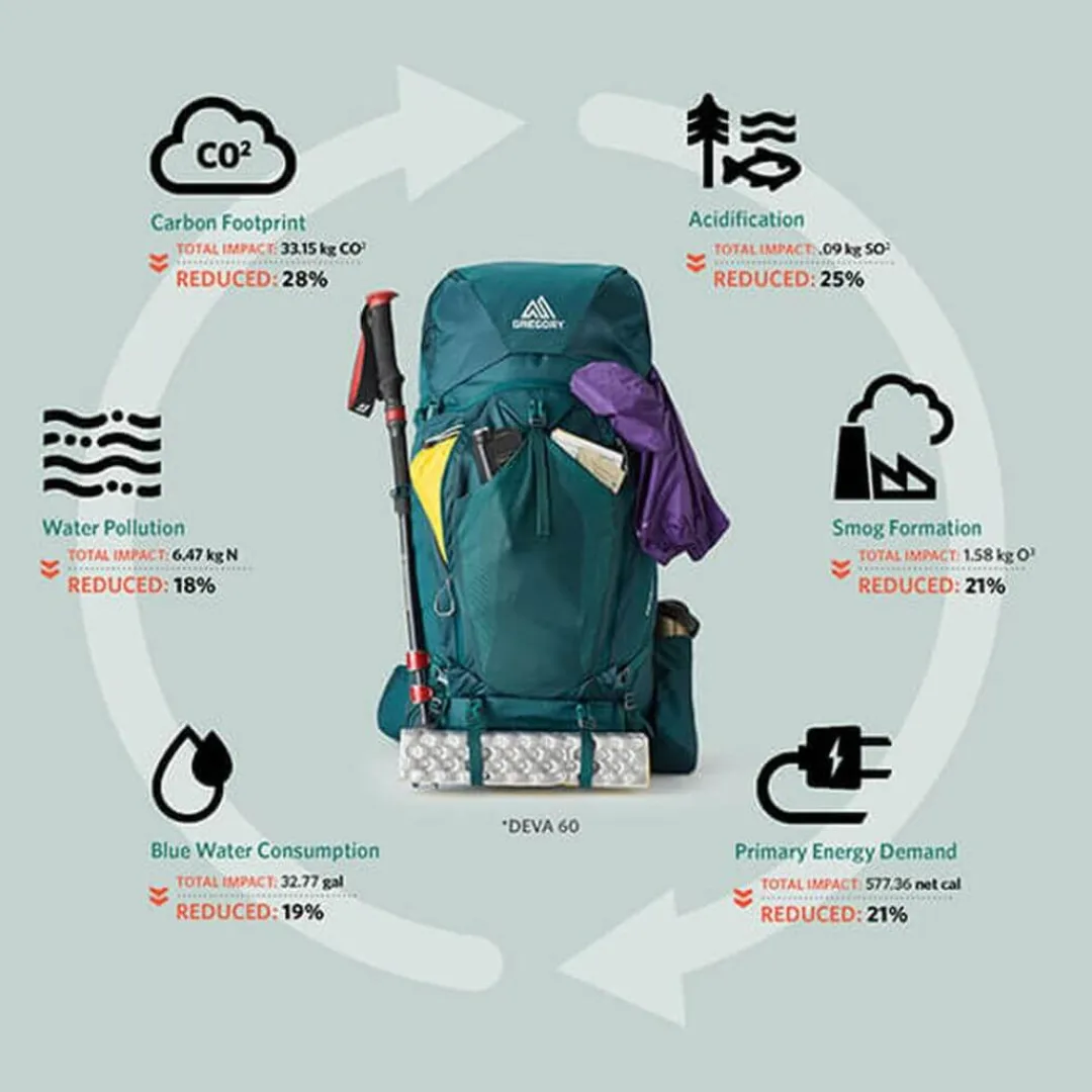 Gregorys Deva er en velsiddende og komfortabel rygsæk med en kapacitet på 70 liter, der uden problemer laster op til 24,9 kg. Deva har et stort hovedrum, der giver plads til din oppakning hvad end du skal på backpacking eller vandring. Rygsækken kan åbnes fra både top og bund, så du nemt kan komme til din oppakning. Deva kan yderligere også åbnes som en sportstaske med en stor flap henover hele hovedrummet. Udover hovedrummet har Deva en række mindre praktiske kommer, der gør det nemt at pakke sit udstyr overskueligt.